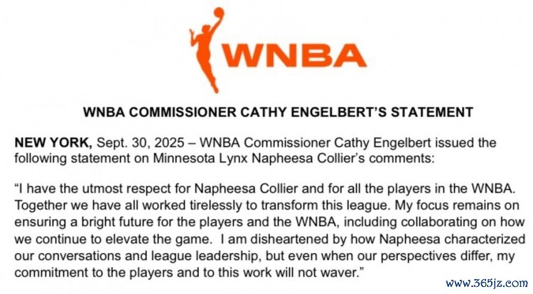 10月1日讯 WNBA总裁凯茜-恩格波特就科利尔的言论进行了官方声明回应。