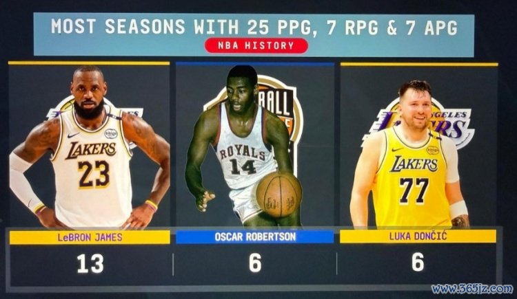 单赛季场均25+7+7场次:詹姆斯13次历史最多 东契奇大O历史第二