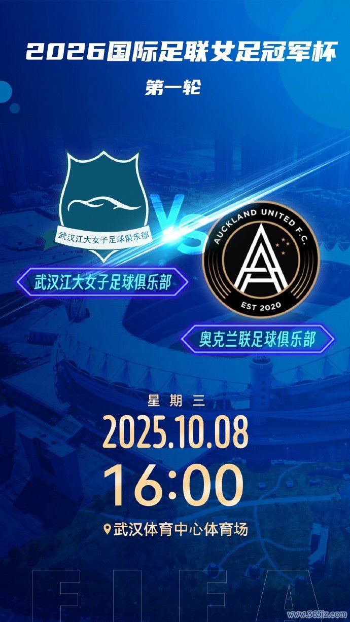 2026国际足联女足第一名 杯第一轮对阵出炉!2024/2025女足亚冠第一名 中国武汉江大女足将主场作战 迎战大洋洲第一名 新西兰奥克兰联,赛事 将于2025年10月8日16:00在武汉体育中心运动场 进行。