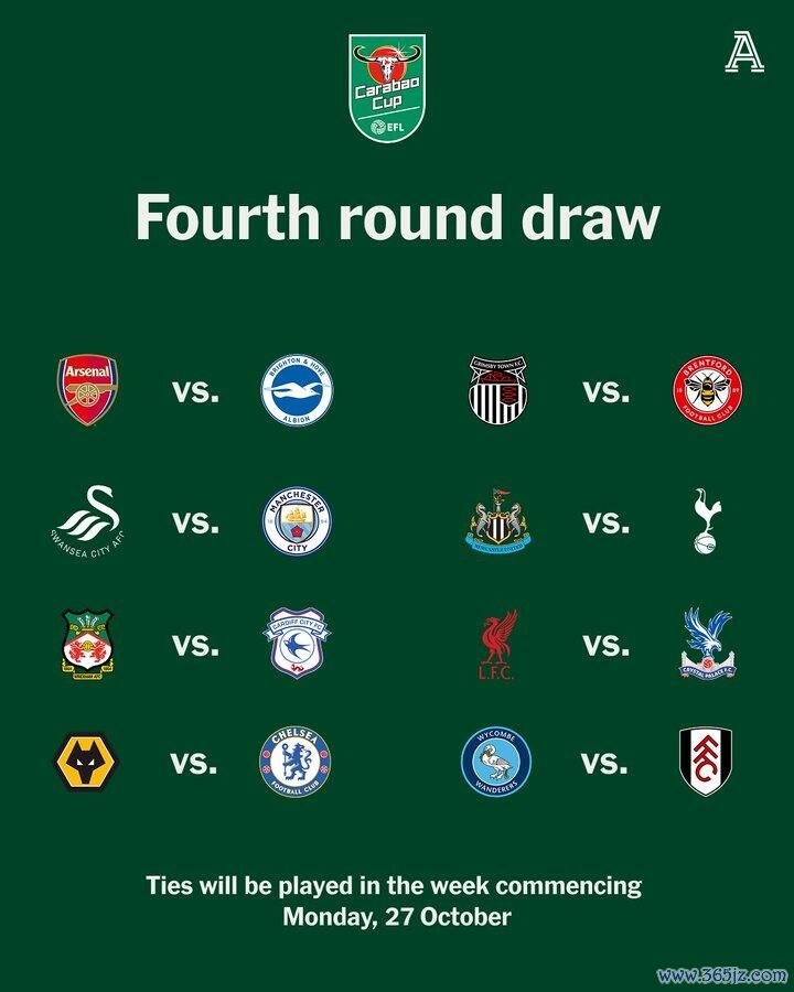 职业联赛 杯第四轮对阵抽签结果出炉,利物浦将对阵水晶宫。