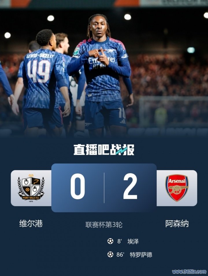 职业联赛 杯第3轮,阿森纳2-0战胜维尔港,晋级下一轮 下一轮,埃泽处子球,特罗萨德建功。