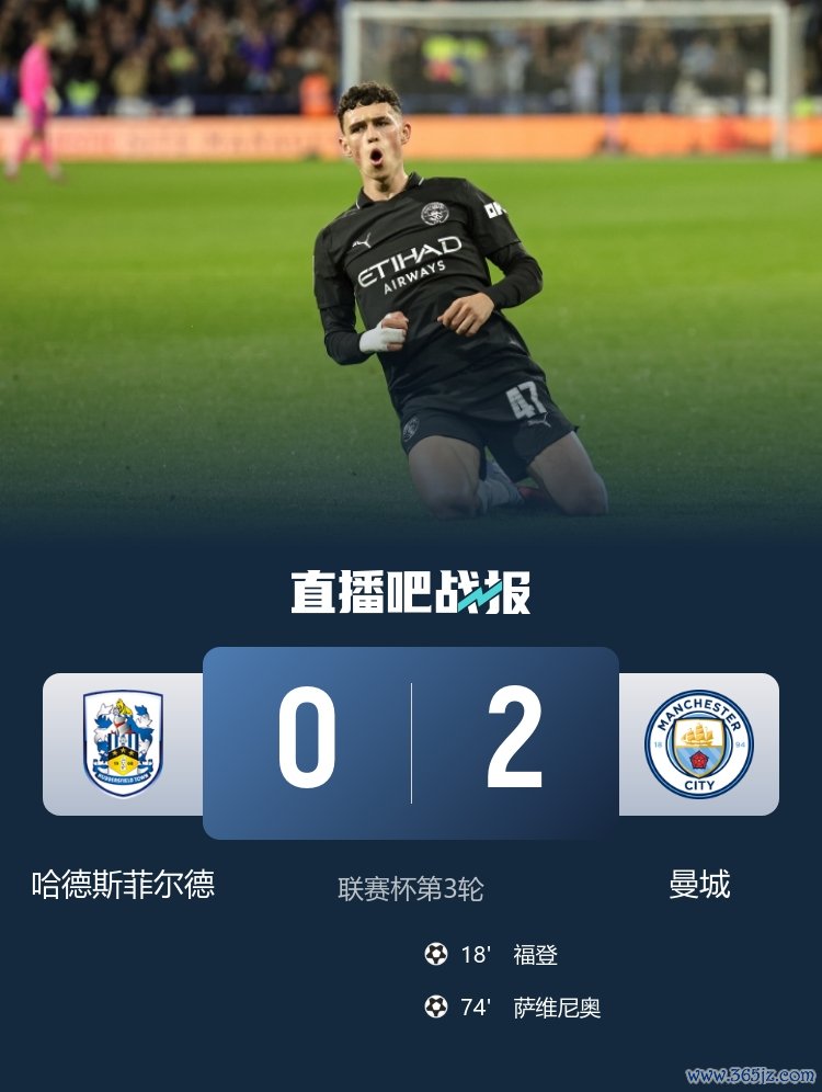 职业联赛 杯第3轮,曼城2-0战胜哈德斯菲尔德,福登、萨维尼奥得分 。