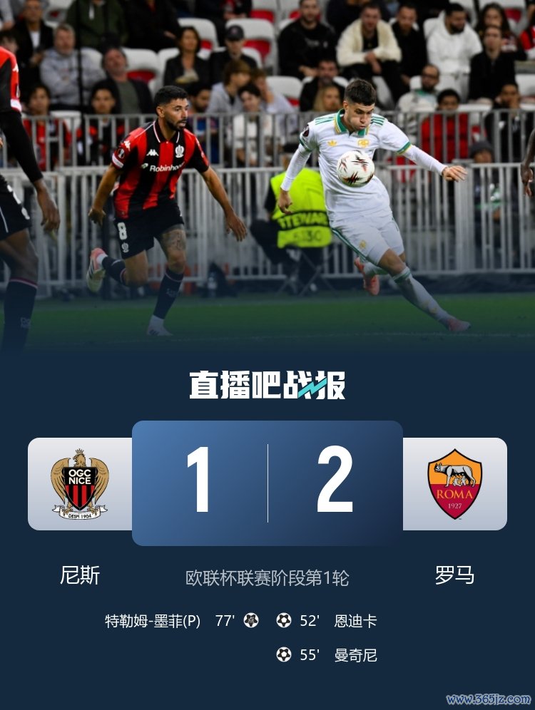 欧联杯职业联赛 阶段第1轮,罗马2-1战胜尼斯,西甲直播恩迪卡、曼奇尼得分 。