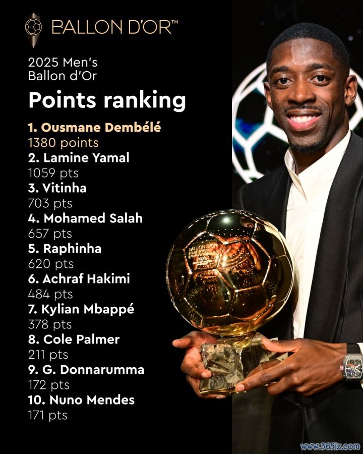 登贝莱1380分第一,第二位亚马尔1059分。登贝莱获得了73张第一选票。