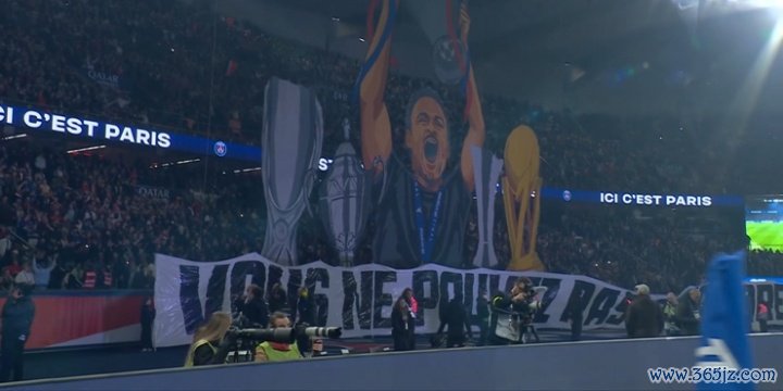 球迷展示巨型TIFO,庆祝登贝莱喜提金球奖和恩里克获颁克鲁伊夫奖