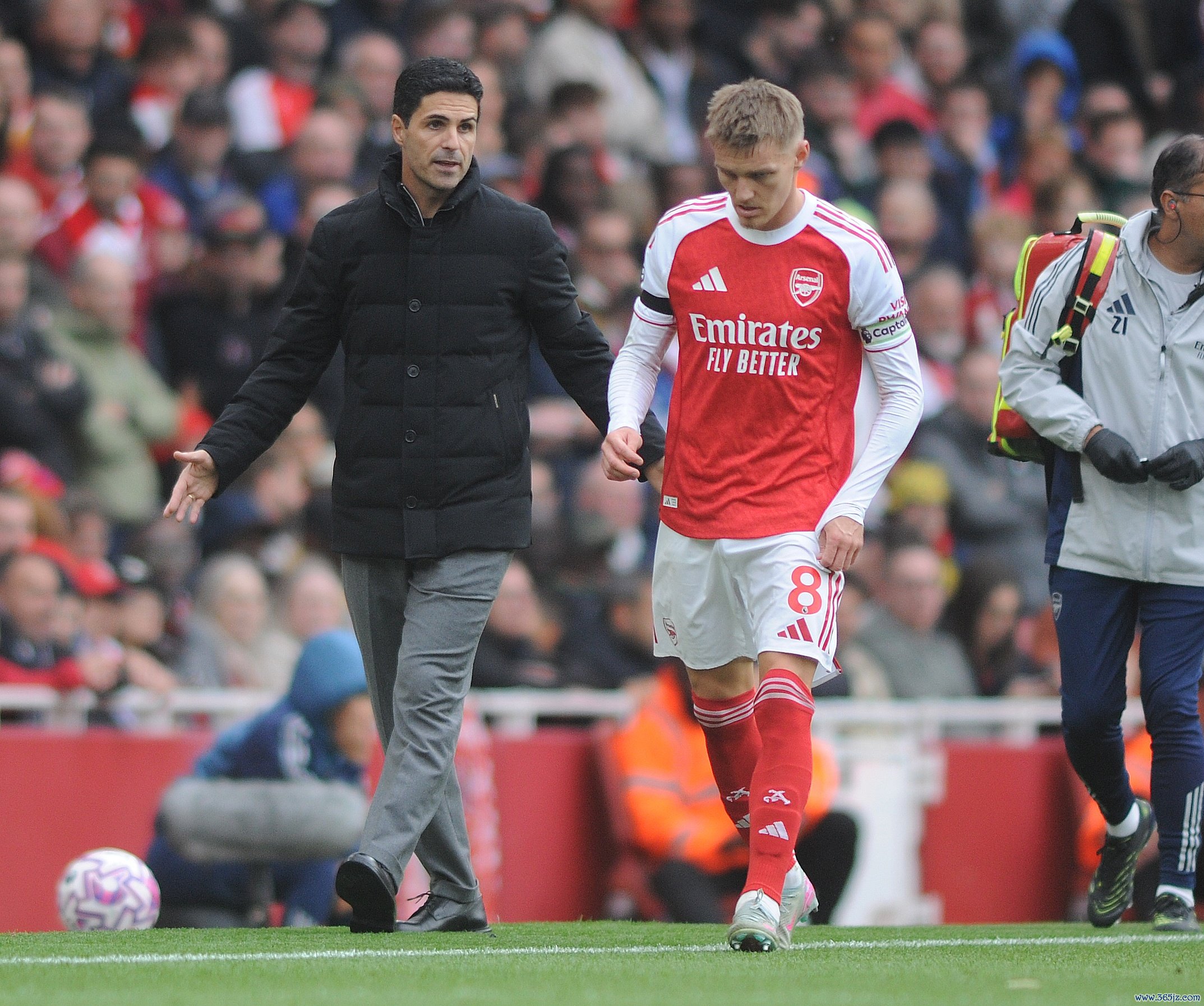 本轮英超阿森纳2-0西汉姆联,厄德高上半场第19分钟与对手膝对膝追尾,随后继续在场上坚守 了10分钟后被伤退离场。