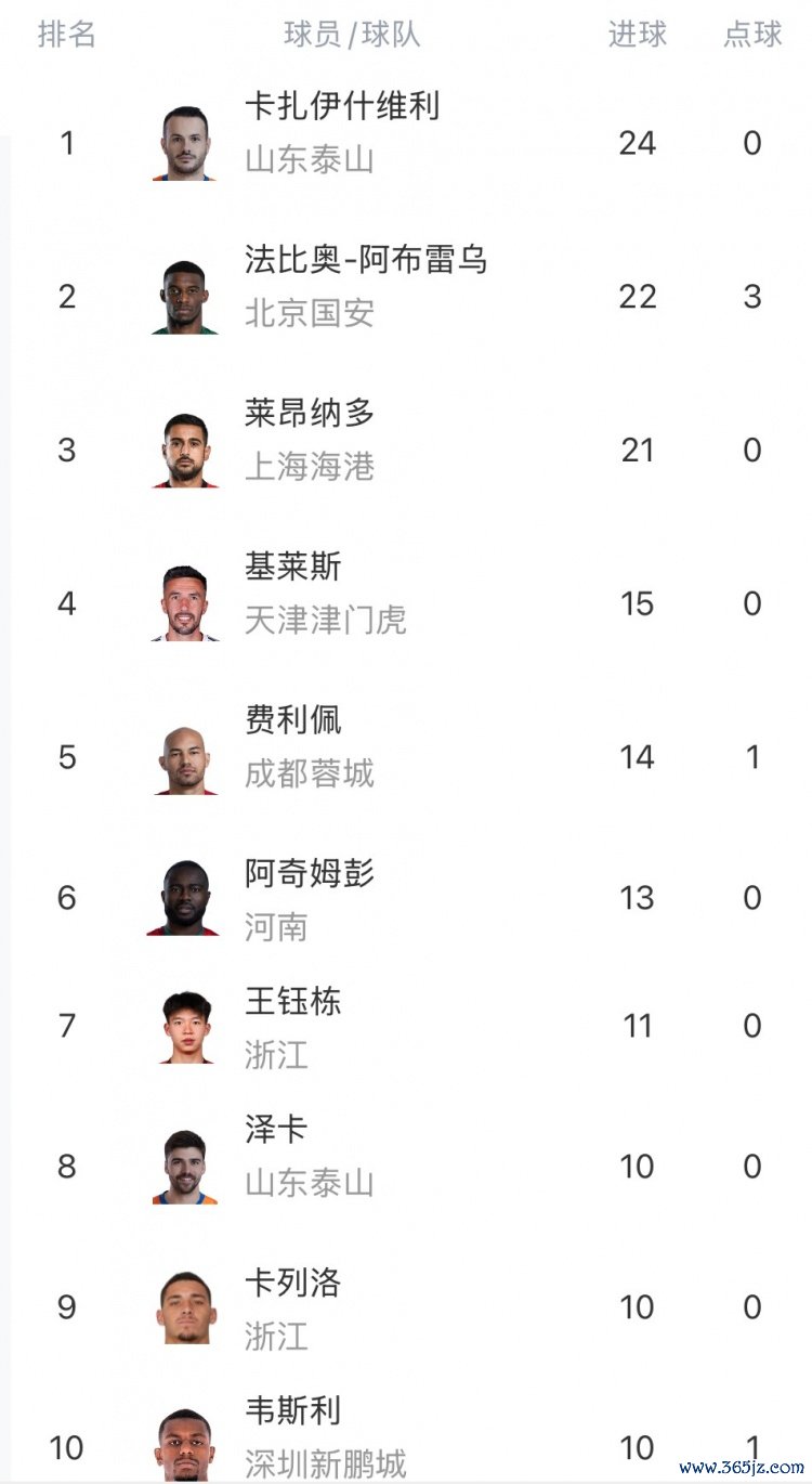 中超射手榜:卡扎伊什维利24球继续领跑,法比奥升至次席