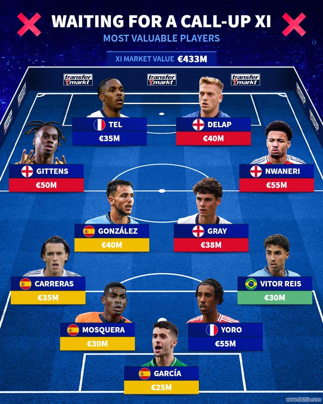 虎扑09月07日讯德国转会市场盘点了当前尚未得到国家队征召的球员,并按照身价组成了一套最佳阵形 。