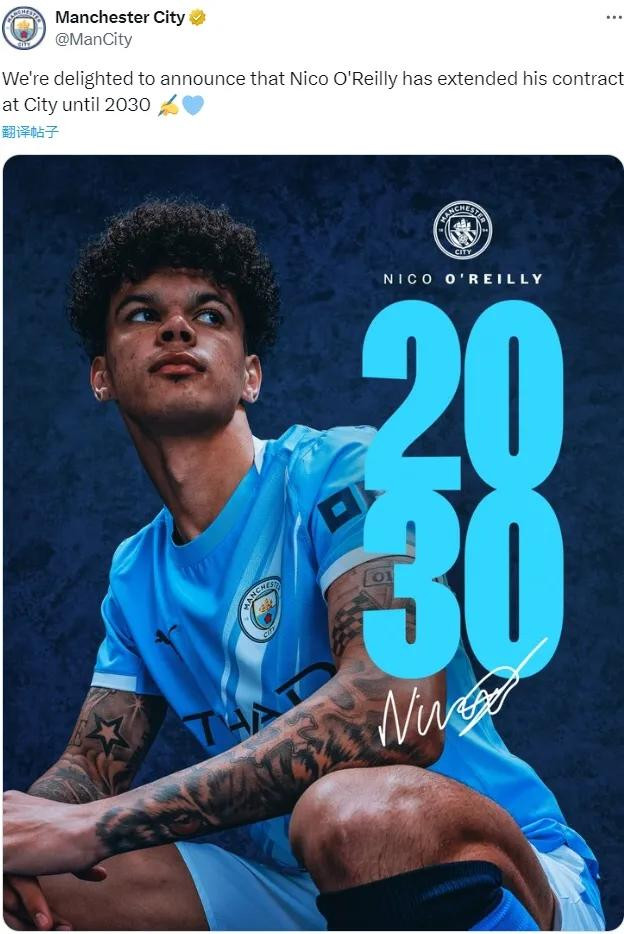 官方:曼城宣布和尼科-奥赖利续约到了2030年。